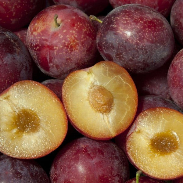 This taste-test favorite is a complex interspecific hybrid, predominantly of plum and cherry, giving it the sweetness of a cherry, combined with that summer fresh plum zing. Much larger than a cherry, but slightly small for a plum, this precocious and prolific variety will hang on the tree for over a month, and the colorful fruit make Sweet Treat a true ornamental. Reaches peak ripeness at the end of July. Tested as 46MB583. Pollinated by Santa Rosa plum, Burgundy plum, Flavor King Pluot®. 200 to 300 hours. (Pat. No. 23796) (Zaiger)