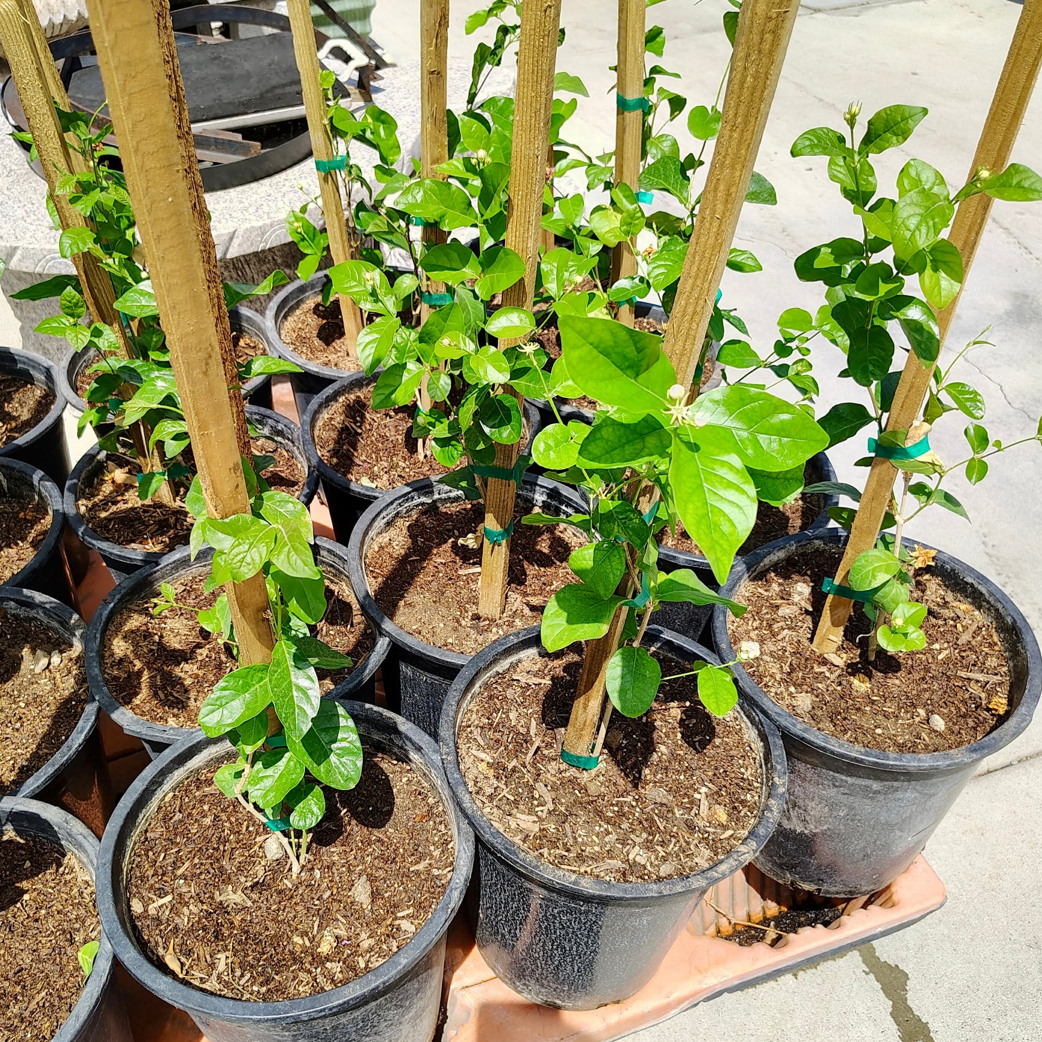 Arabian Jasmine Arabian Nights is a fragrant and visually appealing evergreen shrub. This features glossy dark green leaves and clusters of small, waxy, white flowers that emit a sweet and intense fragrance. Popular for its use in perfumery and cultural ceremonies, 'Arabian Nights' is a compact plant suitable for both gardens and containers, thriving particularly well in warm climates. Its combination of lush foliage and aromatic blooms makes it a sought-after choice among gardeners and plant enthusiasts, adding elegance and sensory delight to outdoor spaces.