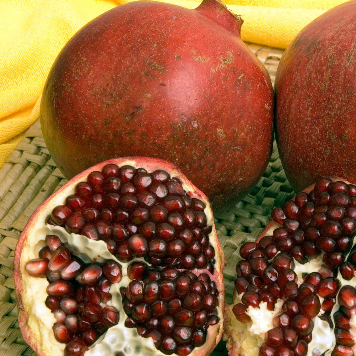 Large sized pomegranate with a very appealing, unique, mildly acid, refreshing flavor. Fruit has a dark red exterior and dark seeds the color of crushed red velvet. Upright growing plant sets huge crops of highly ornamental fruit and can be kept any height with summer pruning. Eat fresh or use in cooking. An excellent source of antioxidants. Requires 150-200 chill hours. Self-fruitful.
