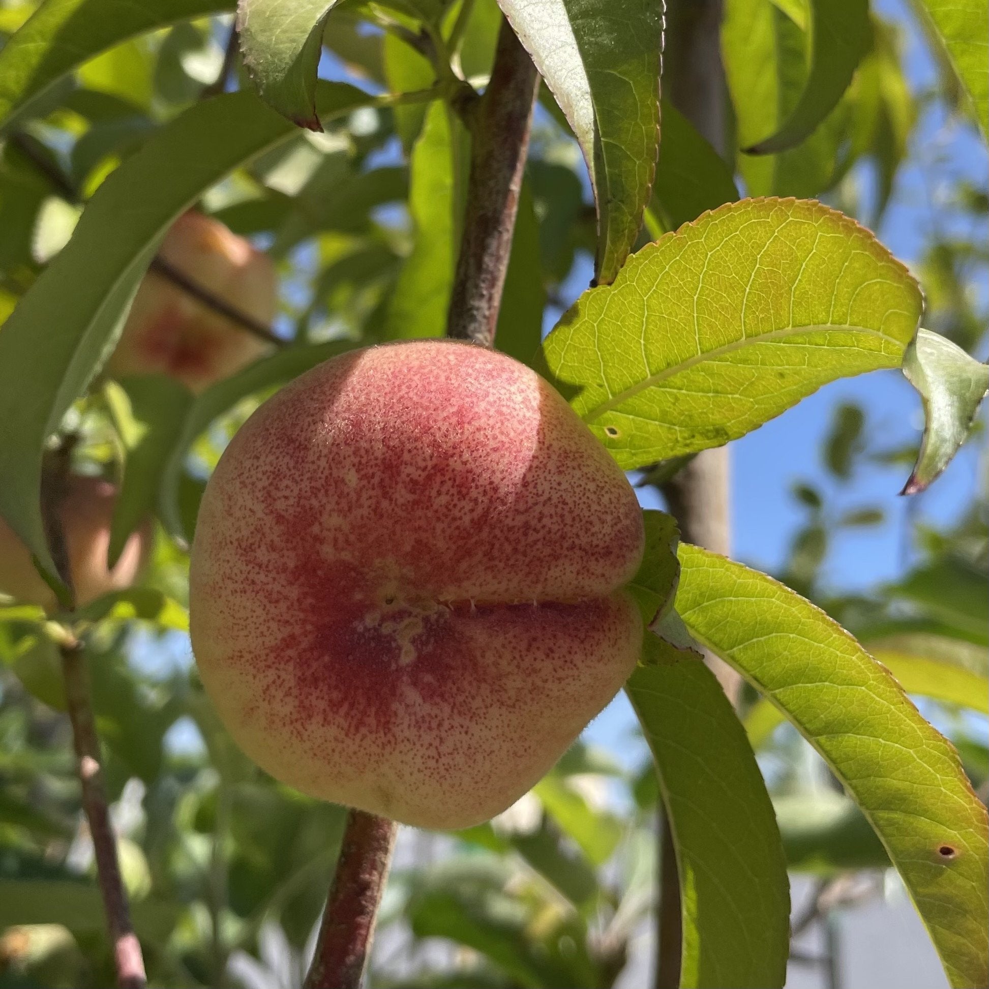 也稱為碟子或 Peento 桃子。獨特的白色果肉水果,中心凹陷(形狀像甜甜圈)。甜甜的,帶有溫和的味道,有些人形容為杏仁味。在加州中部六月底/七月初成熟。預計冷卻需要 200-300 小時。自得其果。